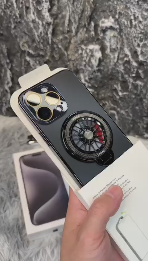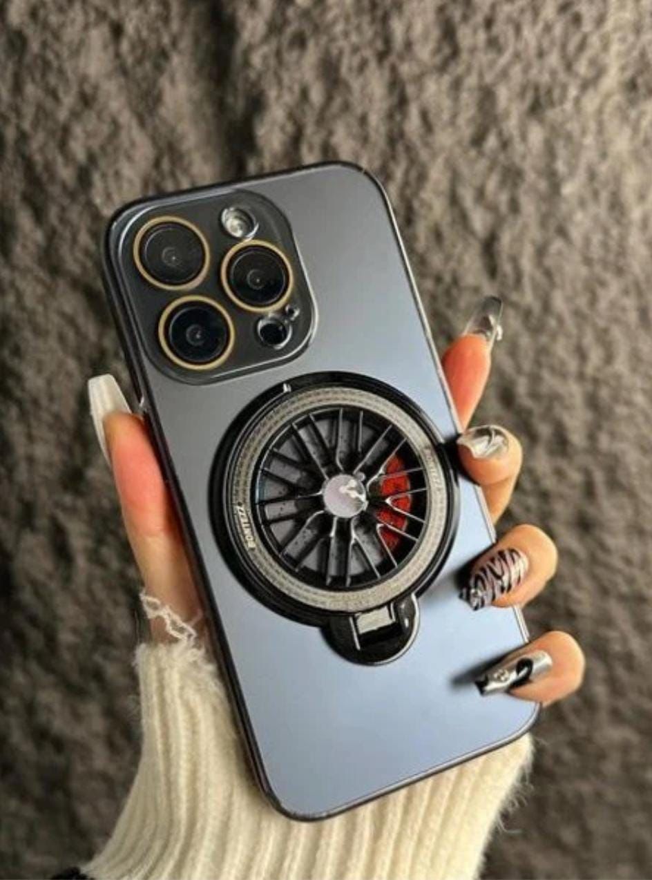The centerpiece of the case is a 3D wheel design that mimics a sports car rim—complete with a brake caliper, vented rotor, and multi-spoke design.